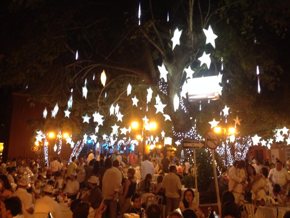 As the sun came down in Cartagena the street vendors rolled up their wares and the restaurants rolled out their table cloths. All over the old town, people organized open-air dinners with music, dancing, and white cloth tables. This one in particular was in one of the plazas with plenty of cute Christmas lights decorating the foliage.