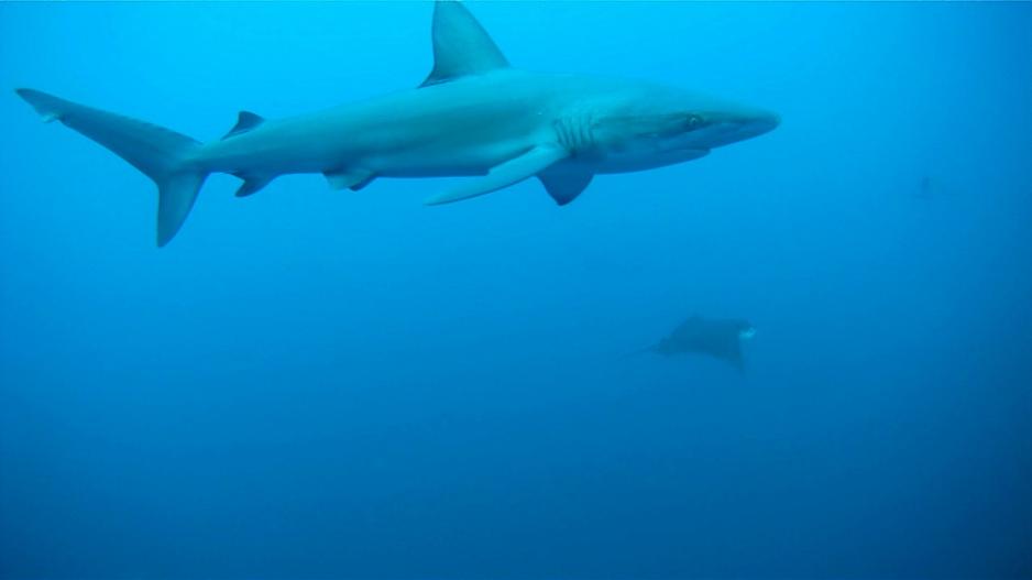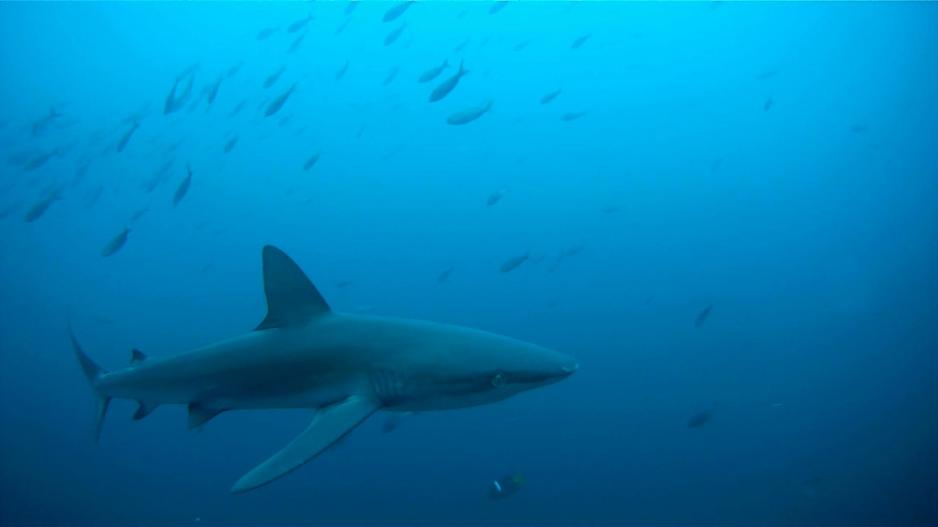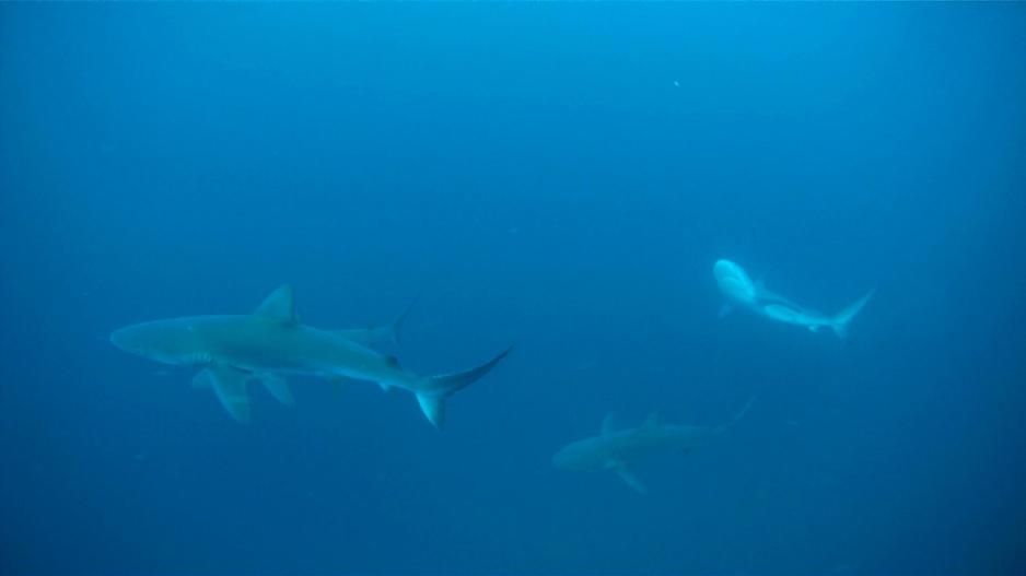 For the first dive we crossed the gap between the two rocks. The first half of the dive was pretty basic and we saw plenty of puffer fish and other small fish swimming around. Shortly after letting a current push us further along we saw our first shark of the day: a white tip! This was immediately followed by a second, and a third, and then I decided to stop counting and just watch as we swam under, beside, and around too many sharks to count.