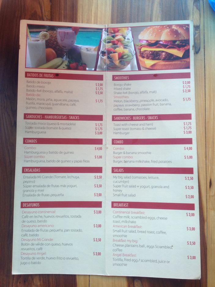 The Desayuno Angel here was absolutely delicious! For $3 it came with a banana milkshake, eggs, and a scrumptious salty pancake made with cheese and fried plantain. Sooooo good.