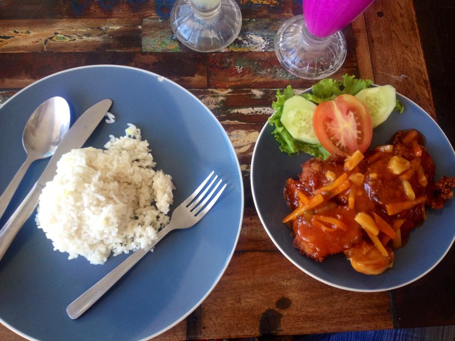 Fried chicken and rice with a sweet sauce. Pretty tasty and simple.